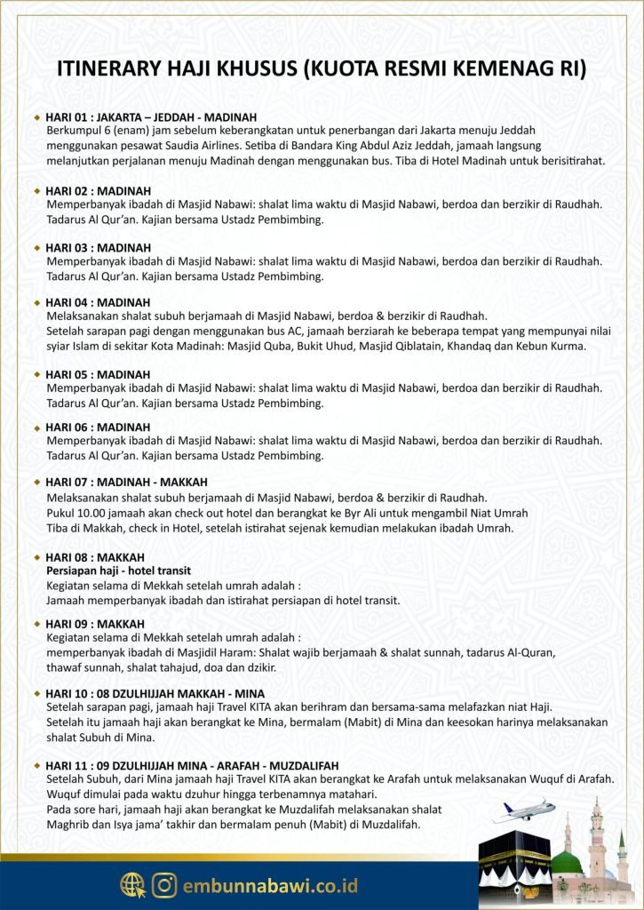 Paket Haji khusus Embun Nabwi mengikuti kouta resmi dari Kementerian Agama RI. Selama di Tanah Suci jamaah akan dibimbing dengan ustadz yang berpengalaman, dokter, mutawif dan petugas teknis. Hotel terbaik yang dekat dengan Masjidil Haram & Masjid Nabawi, transportasi selama di Tanah Suci menggunakan bus AC yang nyaman.