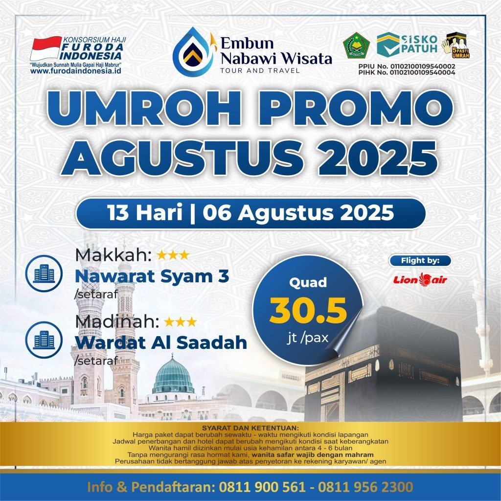 Umroh Promo Agustus 2025. Dapatkan pengalaman umroh yang berkesan di bulan Agustus 2025 bersama Embun Nabawi. Kami akan mendampingi anda dalam setiap langkah, dari mulai saat persiapan keberangkatan hingga pelaksanaan ibadah umroh. Dibimbing oleh Assatidz Ahlus Sunnah yang berpengalaman, perjalanan anda akan semakin bermakna dan tak terlupakan.